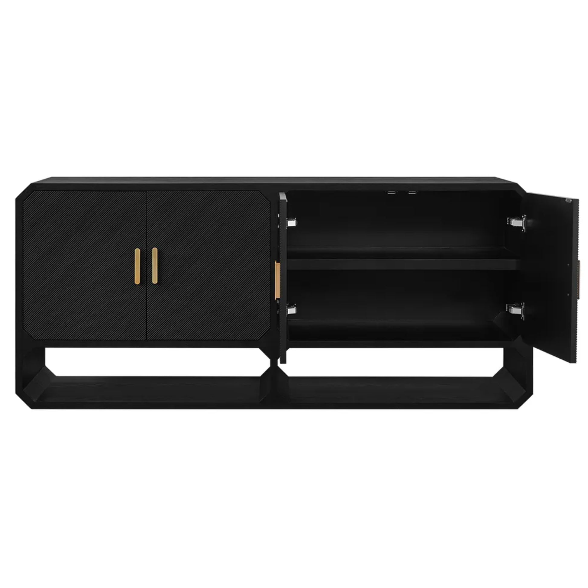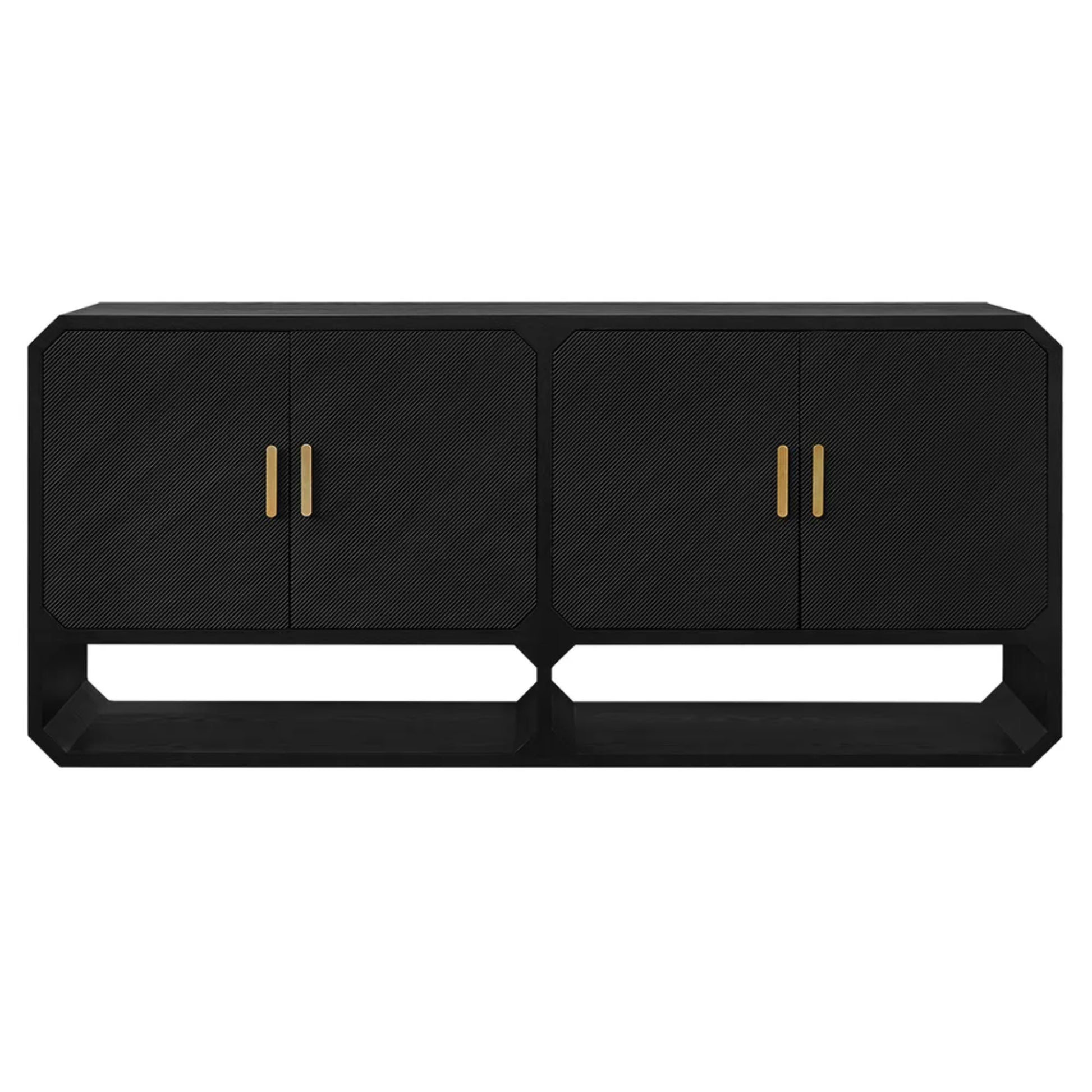 This 180cm wide piece features a painted Deep Black finish over ashwood veneer, delivering both visual sleekness and durability. The four textured doors with soft-close hinges open to reveal generous shelving perfect for entertaining essentials or treasured collections.