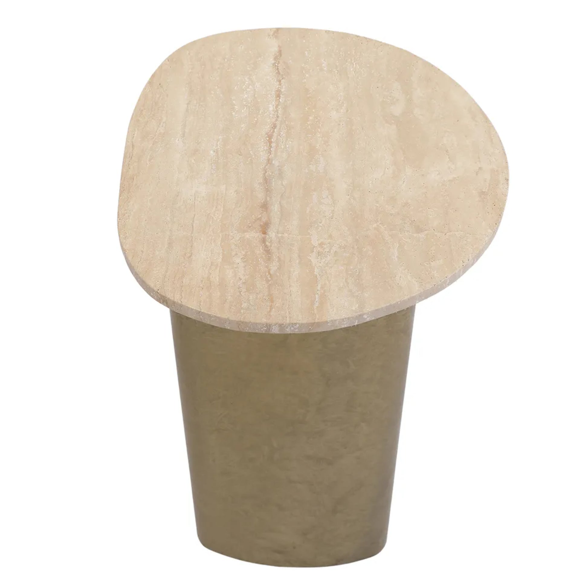 Featuring a smooth travertine top and a modern antique brass-finished base, each piece embodies timeless sophistication. Their asymmetrical designs add a contemporary edge, making them perfect accents for any living room, bedroom, or office.