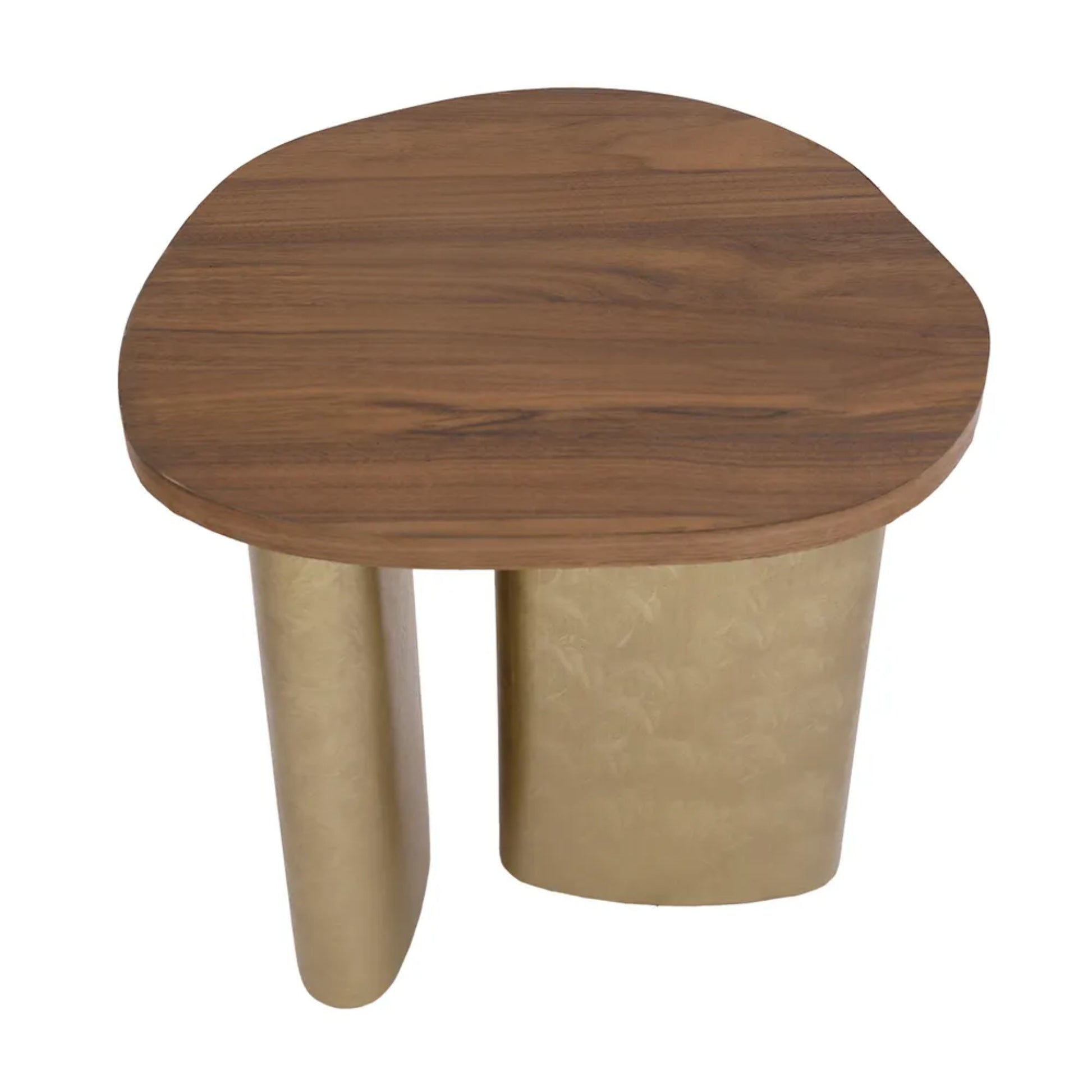 This striking piece features a luxurious travertine top paired with an antique brass-finished base that commands attention through its asymmetrical silhouette.