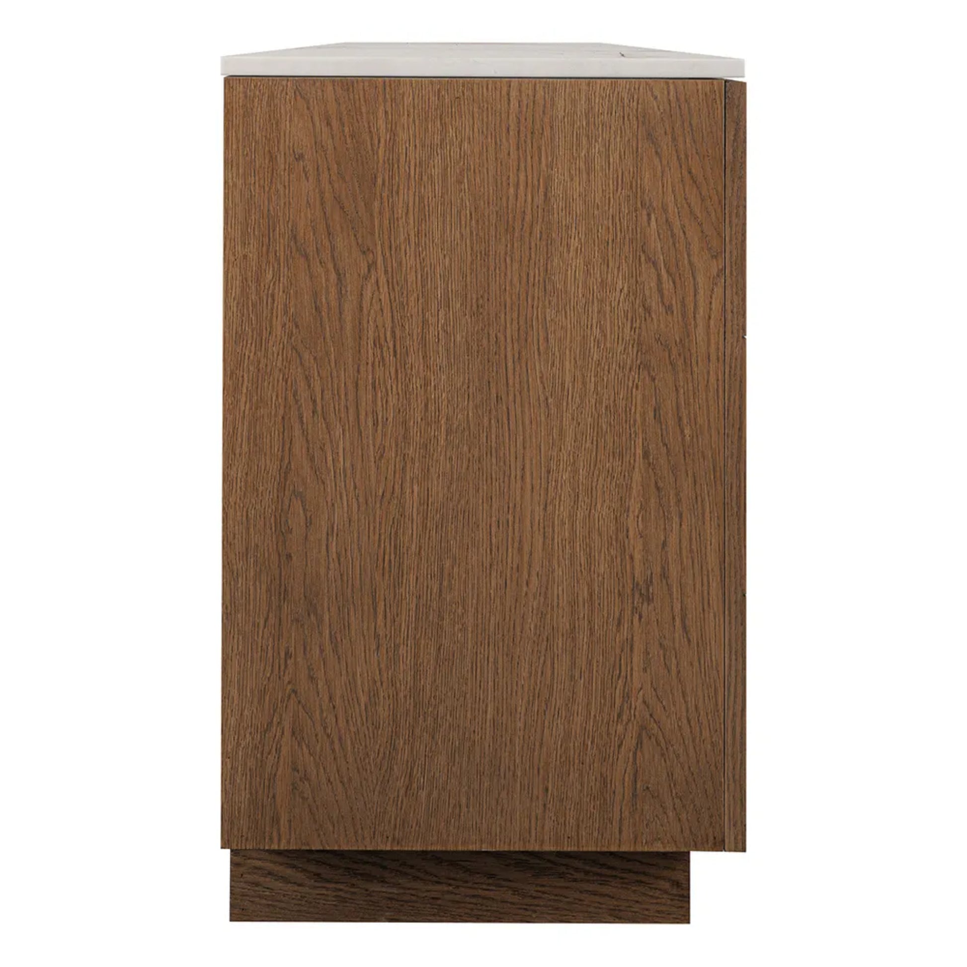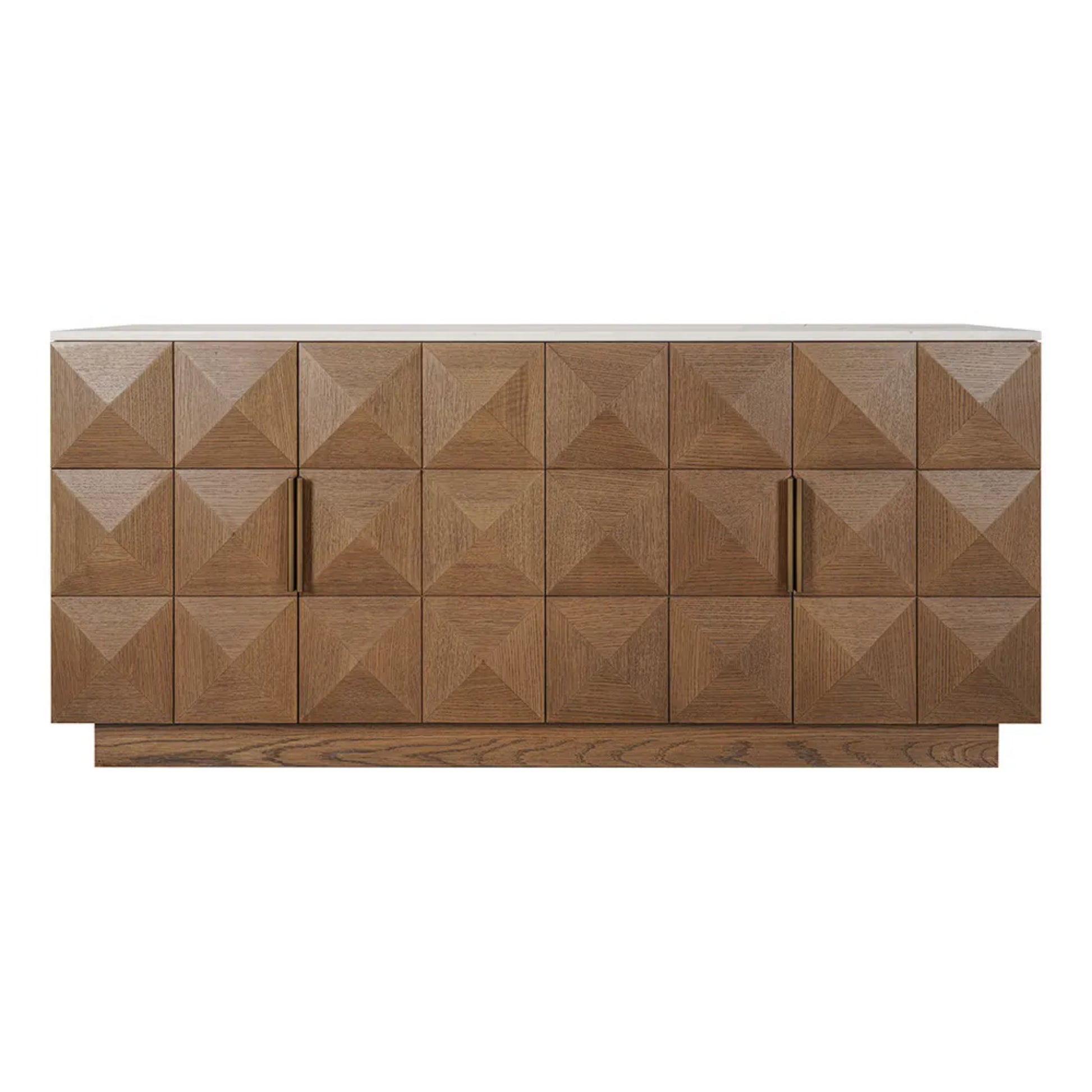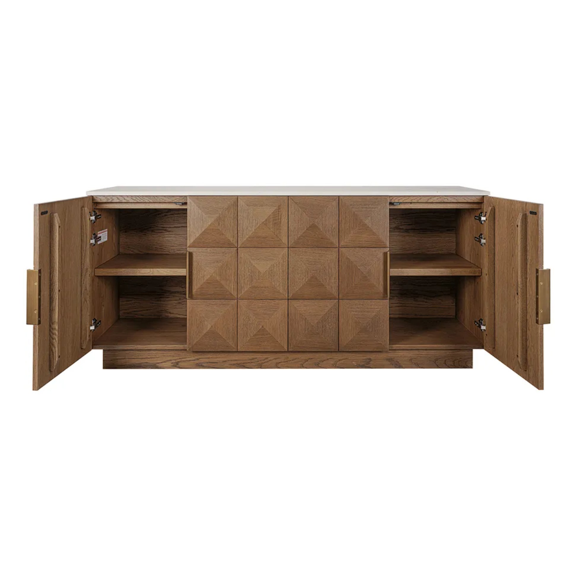 The striking white marble top, with its unique natural veining, anchors a sculptural geometric timber base available in natural oak, walnut, white, or smoked oak. The warm brass handles complement the marble beautifully, while the generous interior storage keeps your home organised without compromising style.