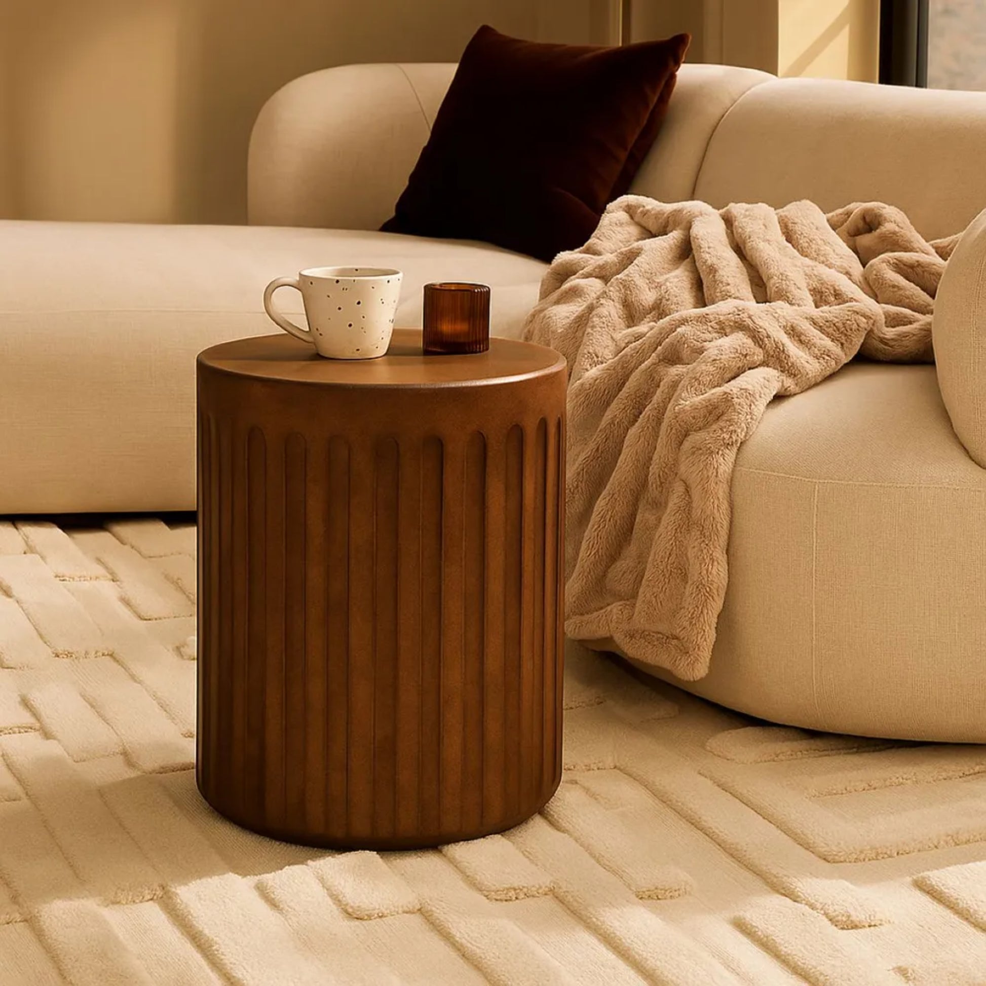 Its distinctive fluted cylindrical form creates striking visual interest while the walnut finish delivers contemporary sophistication.