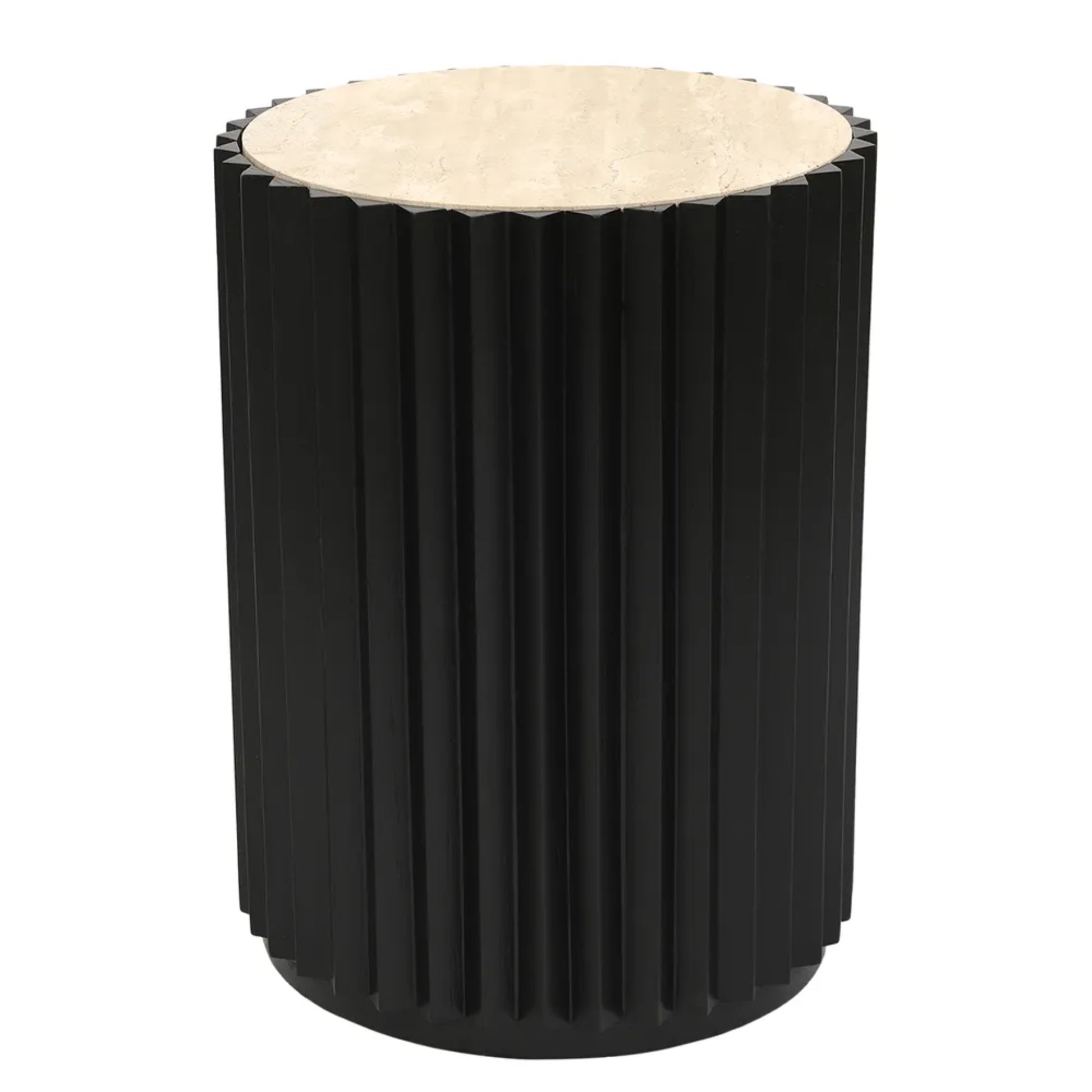 This sophisticated accent table showcases a luxurious travertine top paired with an architecturally inspired fluted base, creating visual depth and refined character.