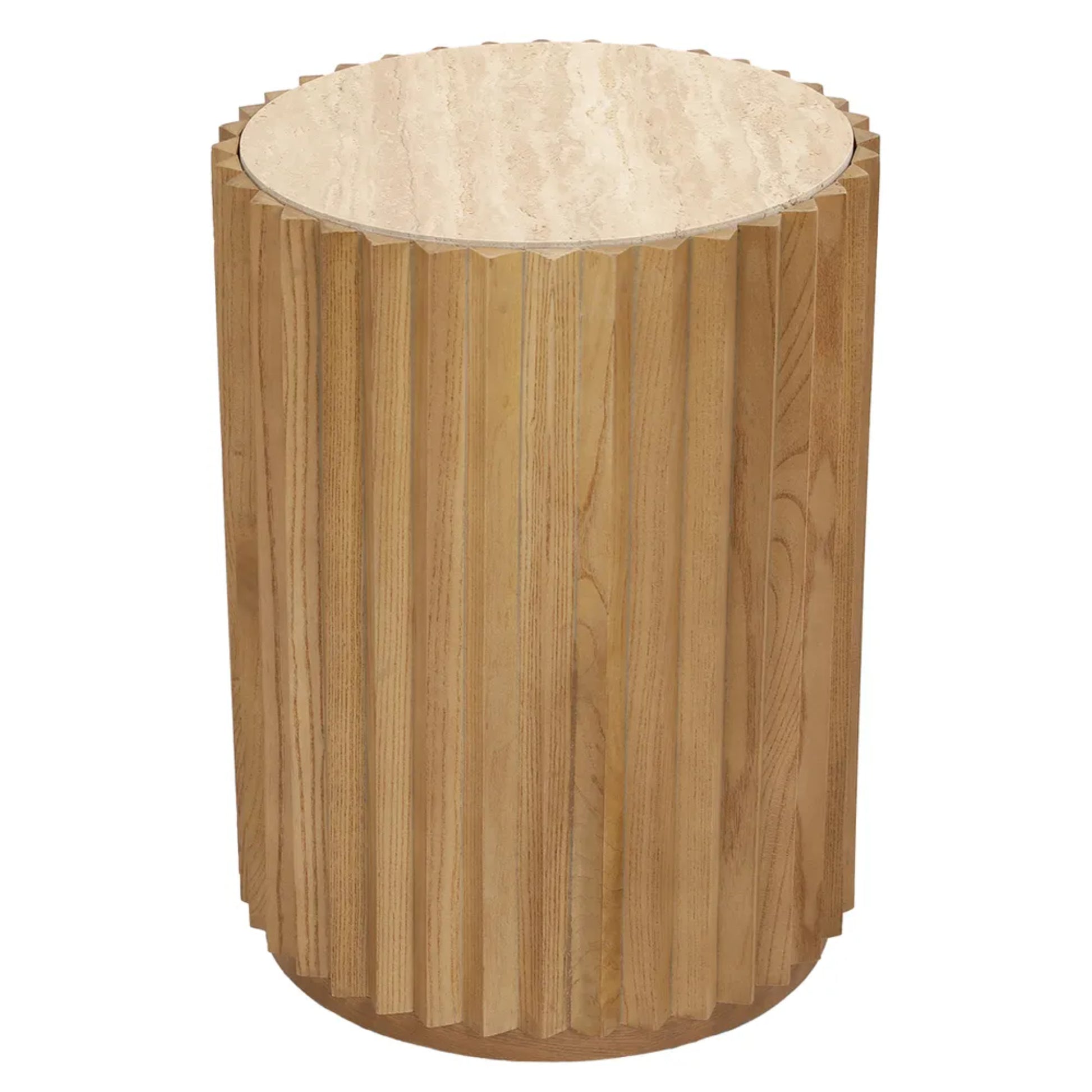 This sophisticated accent table showcases a luxurious travertine top paired with an architecturally inspired fluted base, creating visual depth and refined character.