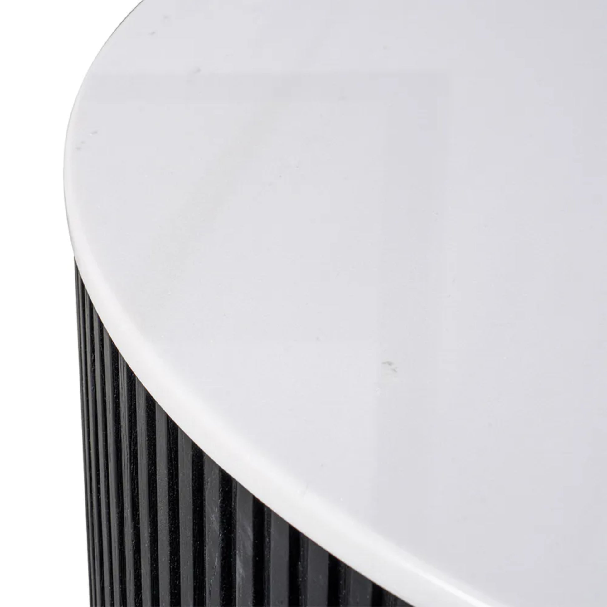 This architectural centerpiece showcases authentic Sivec marble with distinctive natural veining atop a sculptural fluted oak base finished in sophisticated black. The brushed antique gold metal plinth adds a refined finishing touch that catches the light beautifully.