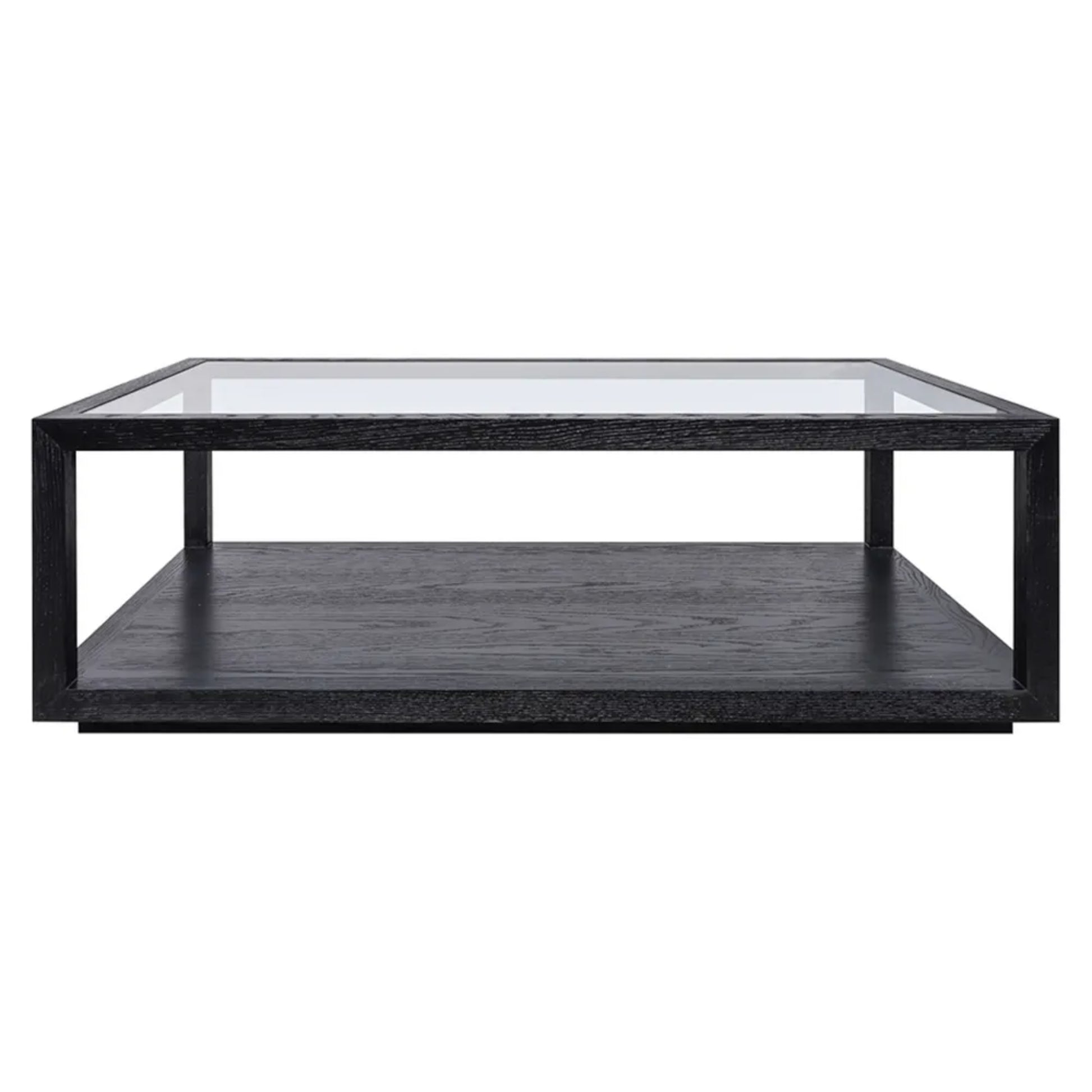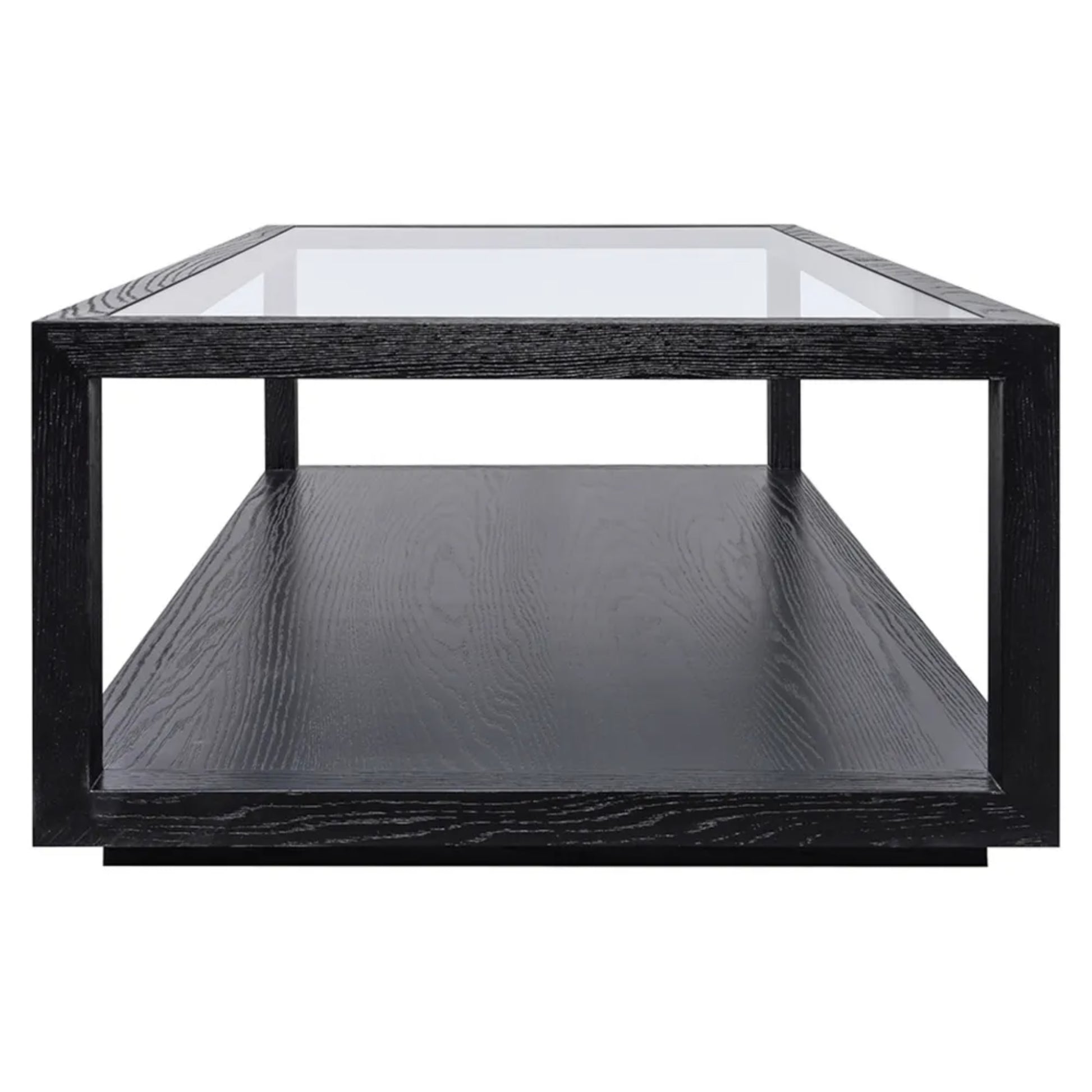 Featuring a deep black oak frame that commands attention while maintaining timeless elegance, this piece effortlessly complements both modern and traditional interiors. The crystal-clear glass top floods your room with light, creating an airy, sophisticated atmosphere, while the lower oak shelf provides practical storage and display space for your favourite décor pieces.