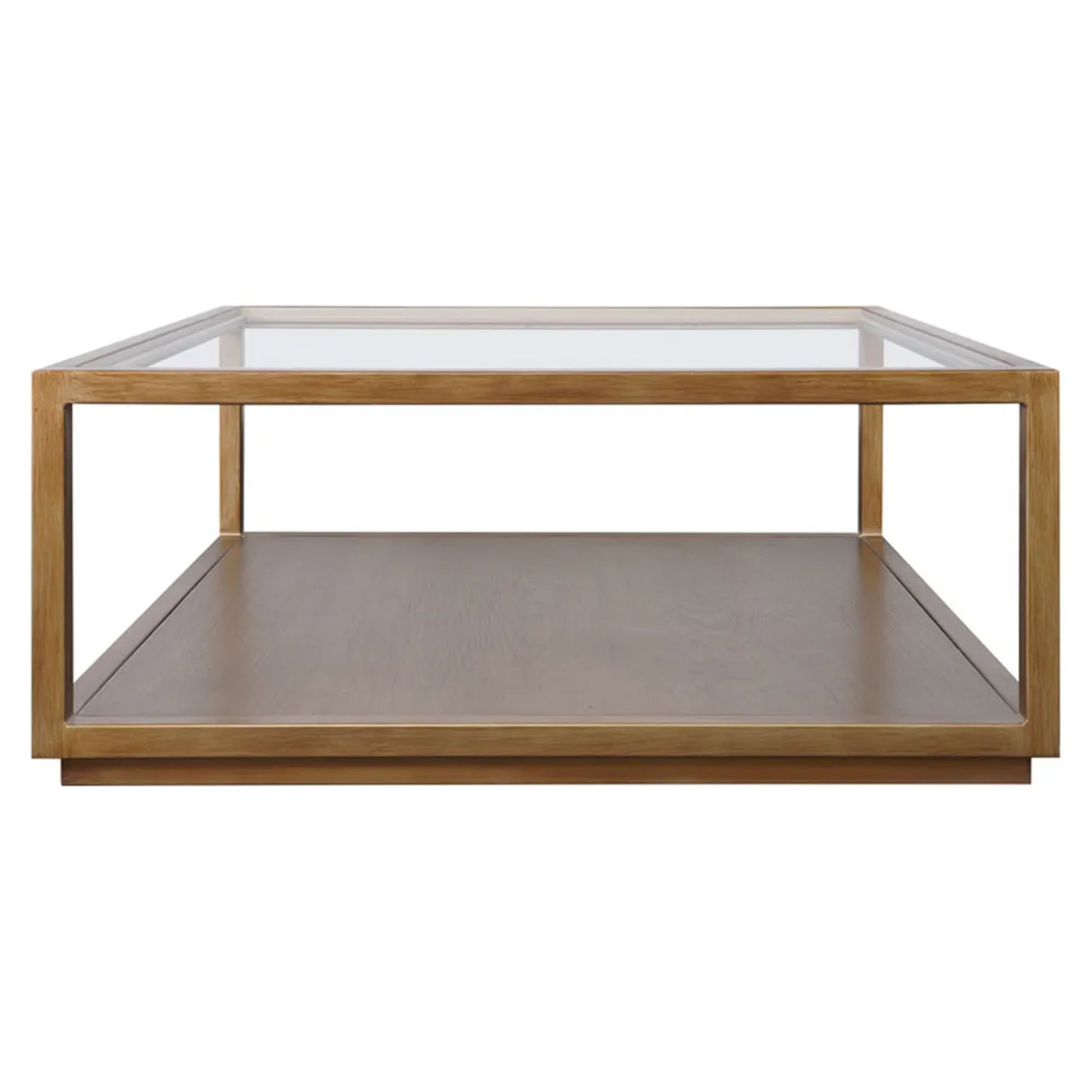 Crafted from brushed oak wood with a sophisticated antique gold finish, this statement piece features a pristine tempered glass top that showcases the frame's refined details while maintaining an airy, open feel. The practical lower shelf provides versatile storage for books, decorative objects, or everyday essentials, seamlessly balancing form and function.